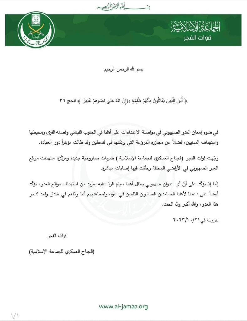 الحج 39 في ضوء إمعان العدو الصهيوني في مواصلة الاعتداءات على أهلنا في الجنوب اللبناني وقصفه القرى ومحيطها واستهداف المدنيين، فضلاً عن مجازره المروّعة التي يرتكبها في فلسطين وقد طالت مؤخراً دور العبادة. وجّهت قوات الفجر (الجناح العسكري للجماعة الإسلامية ) ضربات صاروخية جديدة ومركّزة استهدفت مواقع العدو الصهيوني في الأراضي المحتلة وحقّقت فيها إصابات مباشرة. إنّنا إذ نؤكّد على أنّ أي عدوان صهيوني يطال أهلنا سيتمّ الردّ عليه بمزيد من استهداف مواقع العدو، نؤكّد أيضاً على دعمنا لأهلنا الصامدين الصابرين الثابتين في غزّة، ولمجاهديهم أنّنا وإيّاهم في خندق واحد لدحر هذا العدو، والله أكبر ولله الحمد. بيروت في