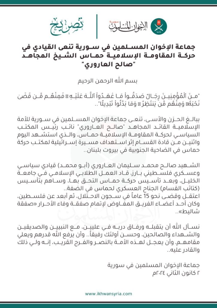New statement from the Syrian Muslim Brotherhood: “Mourning the Leader of the Islamic Resistance Movement, Salih al-‘Aruri”