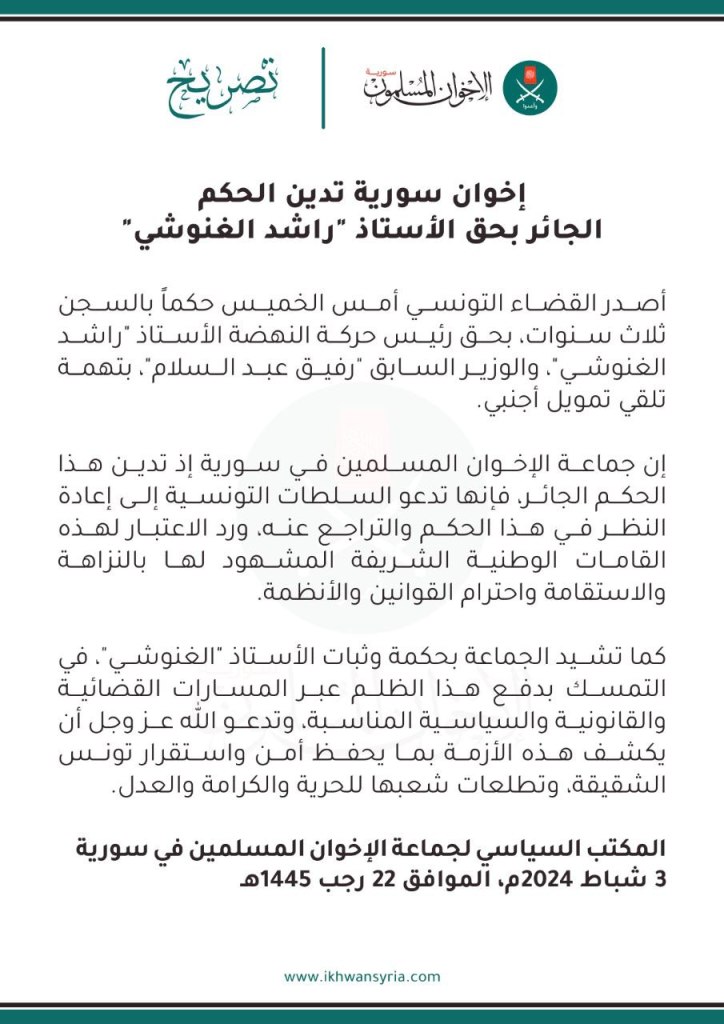 New statement from the Syrian Muslim Brotherhood: “Condemning the Unjust Ruling Against the Head of the Tunisian al-Nahdah Movement, Professor Rashid al-Ghanushi, and Calls on the Authorities To Rescind It”