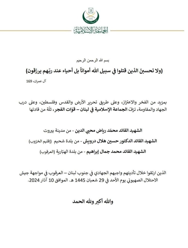 New statement from Jama’at al-Islamiyah: “Denounces the Israeli Enemy’s Targeting of a Center For the Lebanese Ambulance Association”