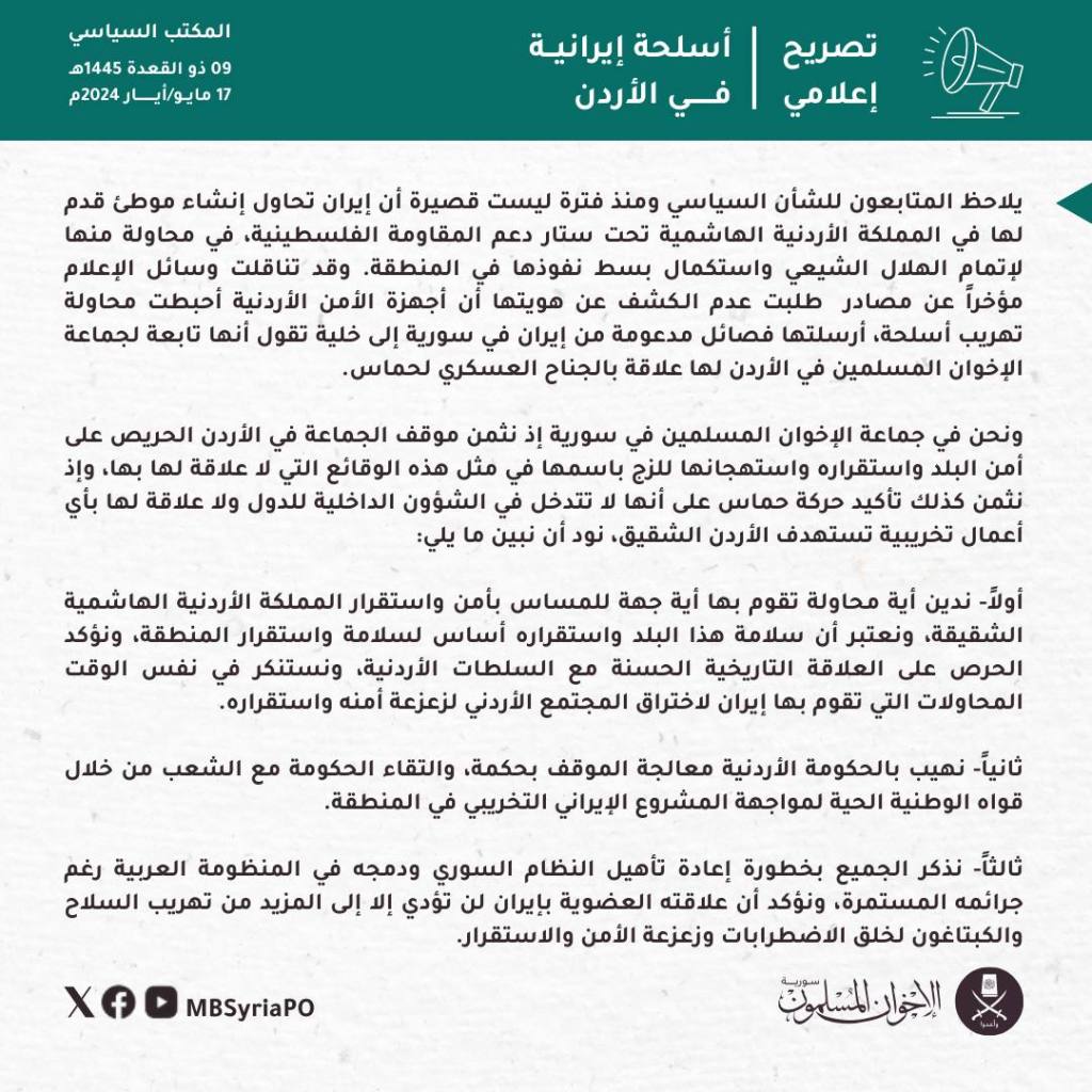 New statement from the Syrian Muslim Brotherhood: “Iranian Weapons In Jordan”