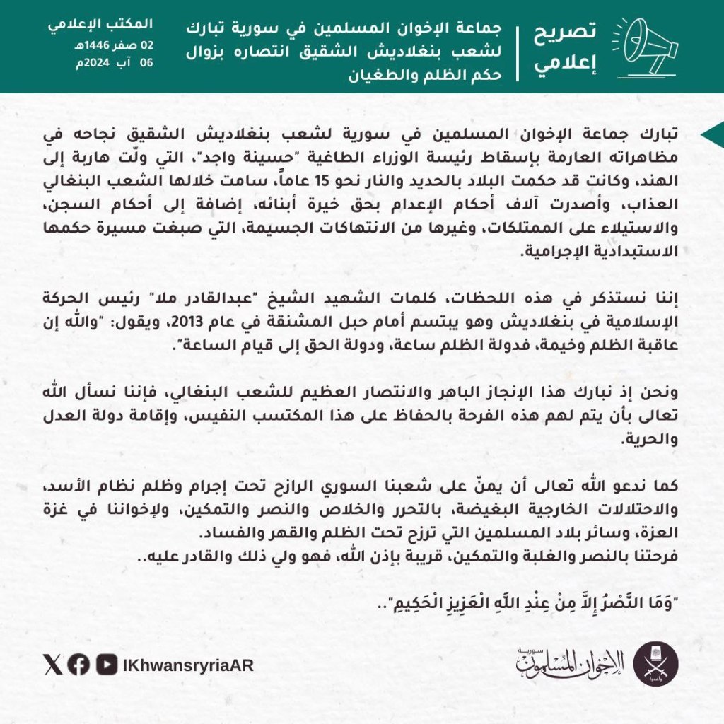 New statement from the Syrian Muslim Brotherhood: “Congratulating the Brotherly People of Bangladesh On Their Victory In Eliminating the Rule of Injustice and Tyranny”