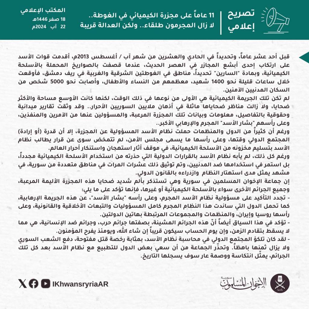 New statement from the Syrian Muslim Brotherhood: “11 Years After the Chemical Massacre In Ghouta.. The Criminals Are Still At-Large.. But Justice Is Near”